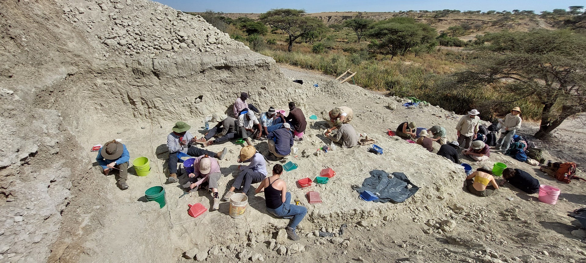 people sitting on dusty ground at an archaeological dig